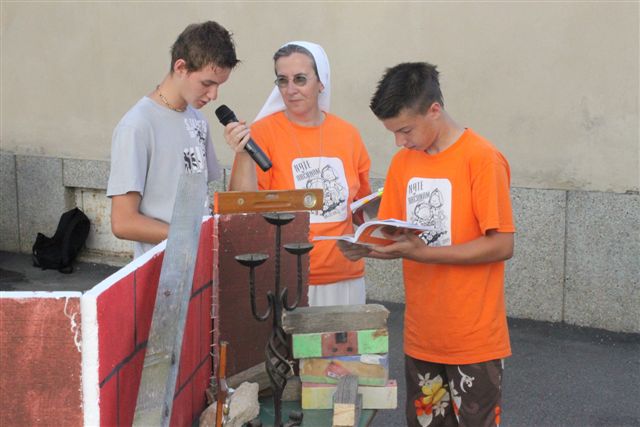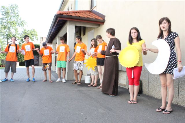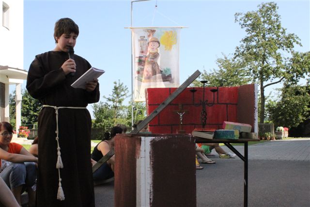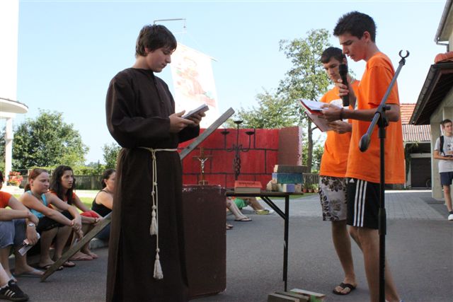 Z molitvijo in duhovno pripravo so animatorji začeli tudi ta dan. Po dvigu zastave in odpeti himni Nate računam, se je nadaljeval običajni program. V prizoru so animatorji prikazali sv. Frančiška, ki je slišal Jezusov glas: "Popravi mojo Cerkev." Frančišek je začel obnvaljati napol porušeno cerkev sv. Damijana, pozneje pa je spoznal, da Jezus želi, naj naredi kaj več za skupnost kristjanov, za Cerkev. Frančišek se je odločil, da izpolni Jezusovo naročilo. Prav tako se je Klara odločila za služenje Bogu.