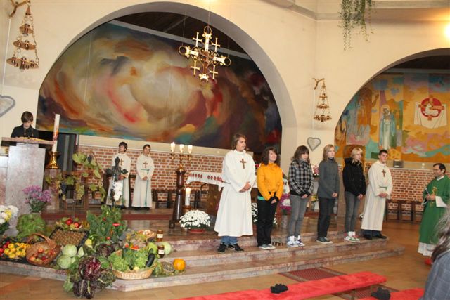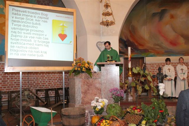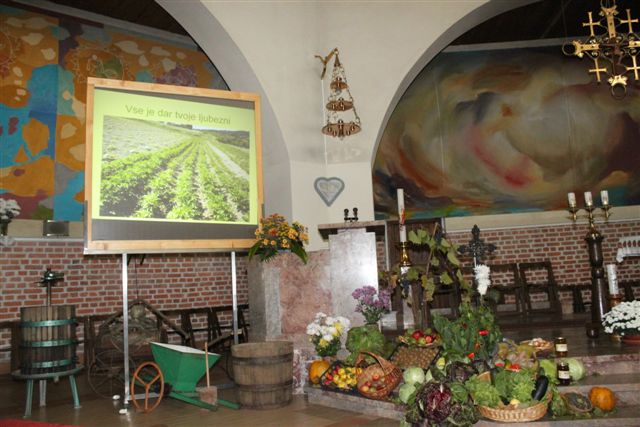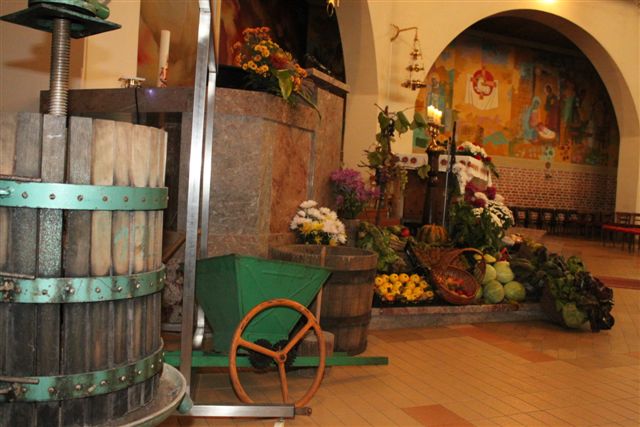 V času, ko pospravljamo še zadnje pridelke, obhajamo v Cerkvi zahvalno nedeljo. Bogu se zahvaljujemo za vse pridelke in za druge darove. Oltarni prostor so okrasili člani ŽPS in nas spomnili, da je zemlja tudi letos bogato obrodila. Pri tem delu so jim pomagali tudi ministranti. S škopilnico, prešo in drugimi pripravami, ki so jih postavili ob oltar, so hoteli povedati, da si mora človek hrano in vse drugo, kar rabi za življenje, priskrbeti s svojim delom. Pri obeh mašah so sodelovali učenci 8. razreda. Za uvod v mašo so v več jezikih izgovorili besedo hvala in nas spomnili, da je hvaležnost nekaj temeljno človeškega. Kljub temu včasih pozabljamo na hvaležnost ljudem in predvsem Bogu.