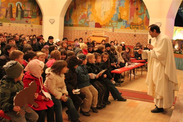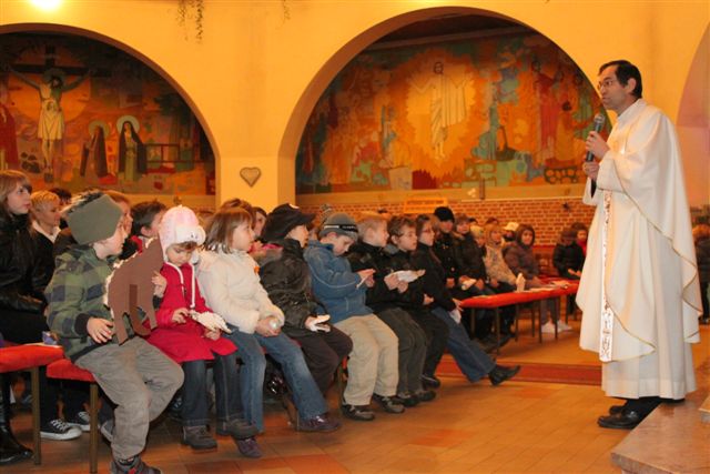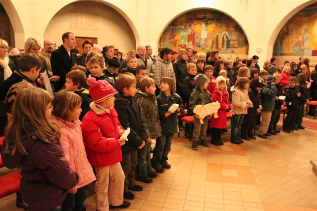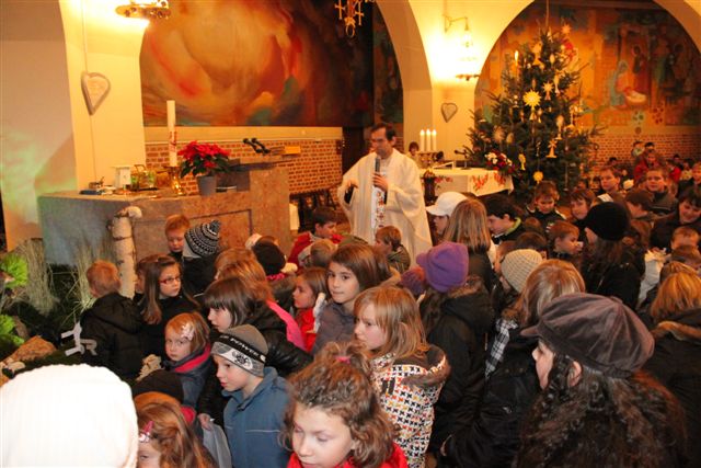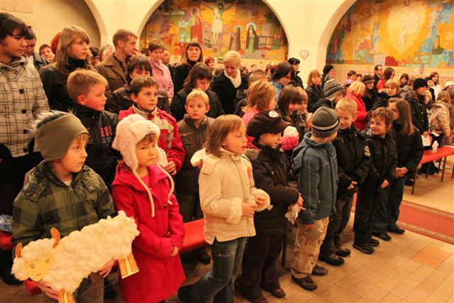 Božično skrivnost so najprej doživeli otroci, ki so se zbrali k večerni maši oz. polnočnici, ki je bila oblikovana za otroke. S petjem so sodelovali učenci 1. in 2. razreda, ki jih je pripravila katehistinja Klavdija Dominko. Pomagali sta ji tudi animatorki Tajda in Melisa. Vsak otrok je prinesel doma izdelano ovčko in jo položil pod božično drevo. Tako so otroci pokazali, da imajo Jezusa radi in želijo biti ob njem.
