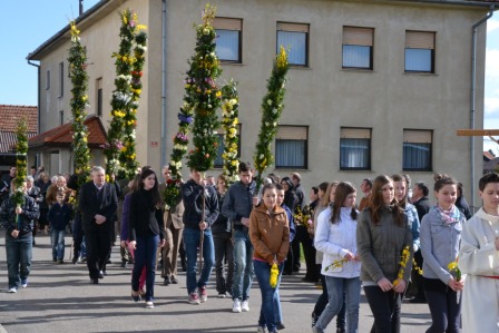 Cvetna nedelja nas vodi v Jeruzalem, kamor je Jezus prišel kot kralj, a kralj, ki bo trpel za svoje ljudstvo. Pri rani maši smo zapeli pesem o Jezusovem trpljenju. Z branjem raznih besedil so sodelovali učenci 8. razreda. Drugo mašo smo začeli zunaj z blagoslovom cvetja, zelenja in butar, ki so jih verniki prinesli s seboj. Še posebej opazne so bile butare, ki so jih naredili verniki po posameznih ulicah. V slovesnem sprevodu smo odšli v cerkev in prepevali v čast Kristusu, našemu Zveličarju. Prisluhnili smo pasijonu, ki so ga zapeli pevci zbora Neuničljivo upanje pod vodstvom organista Franca Zvera. Kot solisti so sodelovali Boštjan Virag, Vinko Ferenčak in Marko Horvat.