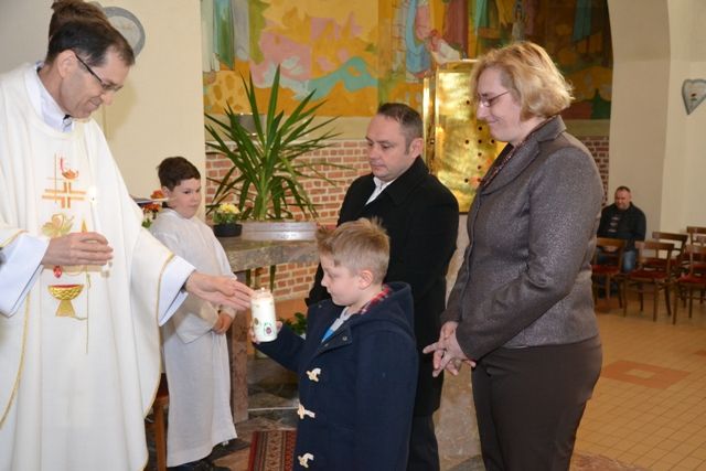 Sedemnajst učencev in učenk drugega razreda se skupaj s starši že drugo leto pri verouku pripravlja na prvo sveto spoved in prvo sveto obhajilo. Na nedeljo Božjega usmiljenja so se predstavili župnijskemu občestvu. Katehistinja Klavdija Dominko je otroke poklicala po imenu. Otrok je s starši pristopil k župniku in mu izročil okrašeno svečo. Ta jo je prižgal s plamenom velikonočne sveče in otrok jo je postavil pred oltar. Otroci bodo svoje sveče do prvega obhajila prižigali zmeraj, ko pridejo k sveti maši. Prižgane sveče nas bodo vabile, da molimo za prvoobhajance in njihove starše. Ob tej priložnosti so starši prejeli karton z molitvijo, da bi se tudi doma s skupno molitvijo pripravljali na slovesen trenutek, ko bo Jezus na poseben način vstopil v njihovo družino.
