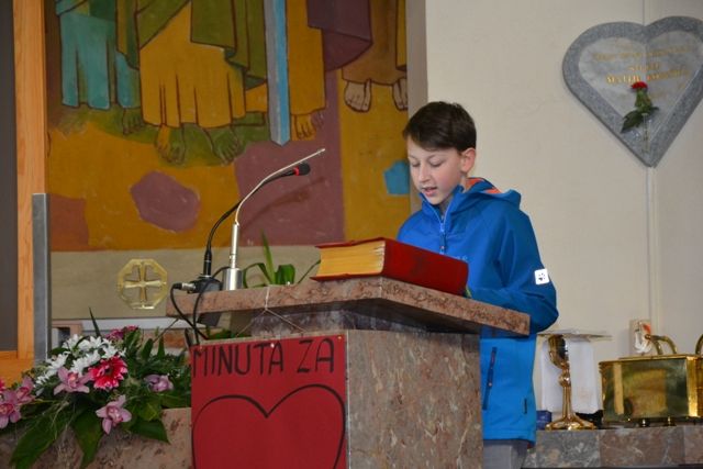Pri sveti maši so z branjem bogoslužnih besedil sodelovali učenci 7. razreda. Bogoslužje so lepšali pevci mladinskega zbora pod vodstvom Helene Vrbnjak. Spomnili smo se nebeške Matere Marije, saj je bil to nedeljo v cerkvi kip fatimske Marije, ki potuje po družinah. Kakor običajno smo molili še za beatifikacijo Božjega služabnika Alojzija Kozarja in Božjega služabnika Danijela Halasa.