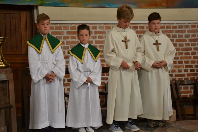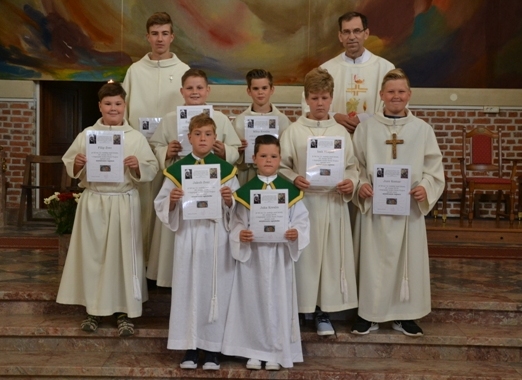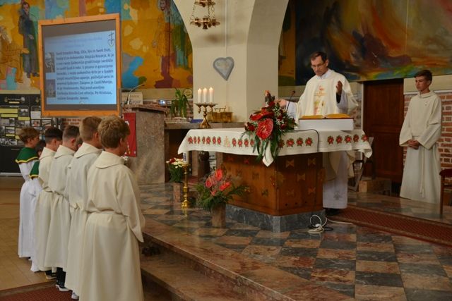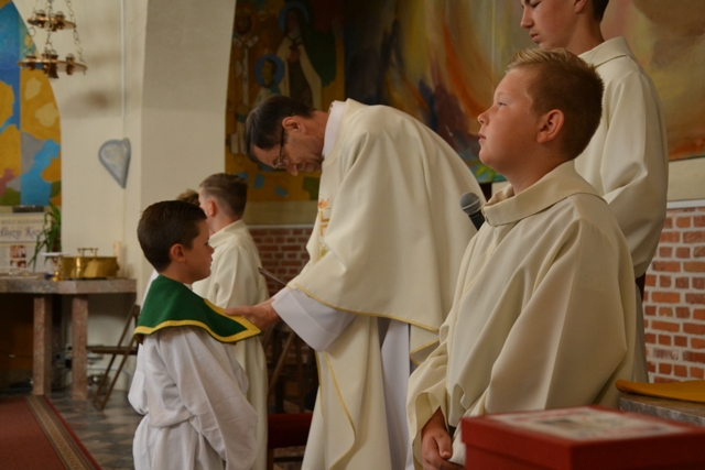 ?Kaj lahko mladi prispevajo k cerkvenemu občestvu? Že to, da so v cerkvi navzoči, da niso samo poslušalci, ampak delavni, da skrbijo in obiskujejo bolnike, berejo berila, so člani zbora ? In najvažnejše: iz njihovih vrst prihajajo duhovni poklici.? Ta misel Božjega služabnika Alojzija Kozarja je nagovarjala predvsem ministrante, ki so pokazali, da želijo dejavno sodelovati v življenju župnije. Dva fanta sta sprejela službo ministranta in sicer prvo stopnje te službe, ko se imenujeta ministranta oglednika, štirje so napredovali v ministrante vajence, eden v ministranta pomočnika, eden pa je postal ministrant mojster. Po pridigi je katehistinja po imenu poklicala pripravnike za posamezne službe, župnik pa jim je izročil znamenja teh služb: ministrantsko obleko, manjši in večji lesen križ, ter kovinski križ kot najvišje znamenje služenja Bogu in župniji. Po sprejemu so ministranti izrekli prošnje, nato pa z različnimi dejanji sodelovali pri sveti daritvi. V pridigi smo se spomnili sv. Janeza Krstnika in sv. Alojzija Gonzaga, ki je še posebej vzornik in priprošnjik mladih. V spomin na sprejem služb so ministranti prejeli spominske listine. Po sveti maši je sledilo druženje skupaj s starši v veroučni učilnici.