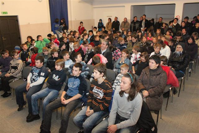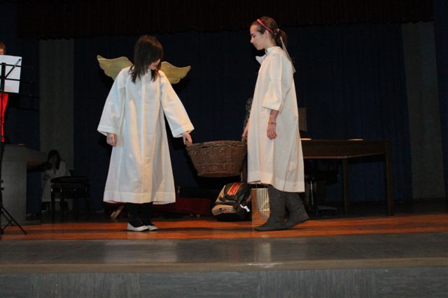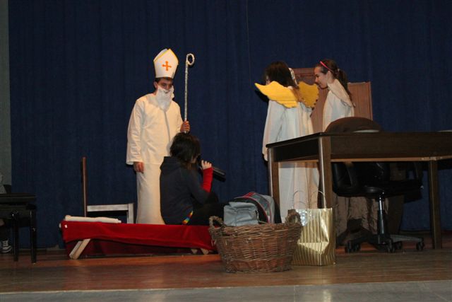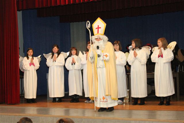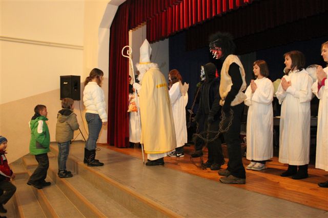 Ob 17. uri pa so se v dvorani vaškega doma zbrali šolarji od 3. do 9. razreda. Učenci in učenke 9. razreda so uprizorili igro Katja brez veze in pokazali, kako ima vsako dobro delo svojo vrednost, in da se je za dobre stvari vredno potruditi. Za odlično uprizorjeno igro se jim je zahvalil voditelj Župnijske karitas Mirko Vrbnjak. V dvorano je prišel Miklavž v spremstvu angelov in tudi parkljev. Angeli so imeli veliko dela z razdeljevanjem daril, parklji pa so zaradi pridnih otrok ostali brez dela. God sv. Miklavža je priložnost za vse, da naredimo kaj dobrega in tako postajamo podobni svetnikom.