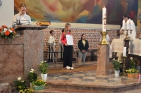 Na nedeljo dobrega pastirja smo obhajali obletnico smrti Božjega služabnika Alojzija Kozarja. V pridigi smo razmišljali o Jezusu, ki je o sebi povedal, da je dobri pastir. Kot dobrega pastirja ga je doživljal tudi Božji služabnik Alojzij Kozar, zato se je tudi sam trudil, da bi bil vernikom dobri pastir. Na kratko smo se spomnili še drugih oznanjevalcev, ki so bili v tej vlogi. Pri sveti maši so sodelovali predstavniki vseh razredov. Nekateri so brali prošnje, nekateri pa so prinesli darove v zahvalo za Božjega služabnika, ki je bil dobri pastir za otroke (veroučna knjiga Krščanski nauk 4), za ministrante (seznam ministrantov), za pevce (notni zapis), za družine (knjiga Pisma staršem), za duhovne poklice (knjiga Premakljivi svečnik), za vse vernike (brevir), za odranske vernike (knjiga Neuničljivo upanje), za vse ljudi (kelih). Sodelovali so tudi pevci obeh zborov. V začetku svete maše so učenci 1. razreda pred podobo Jezusa dobrega pastirja prinesli risbe, na katerih so predstavili sebe in s tem povedali, da želijo biti ob Jezusu. Po obeh svetih mašah smo odšli do groba Božjega služabnika, kjer smo zmolili molitev za njegovo beatifikacijo.